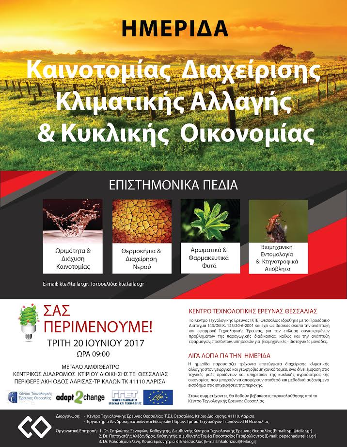 Το Κέντρο Τεχνολογικής Έρευνας Θεσσαλίας (ΚΤΕ/Θ) και το εργαστήριο "Δενδροκηπευτικών και Εδαφικών Πόρων" (HortLab) του ΤΕΙ Θεσσαλίας, διοργανώνουν στις 20 Ιουνίου 2017 και ώρα 09:00 ημερίδα με θέμα: ¨Καινοτομία Διαχείρισης Κλιματικής Αλλαγής και Κυκλικής Οικονομίας".