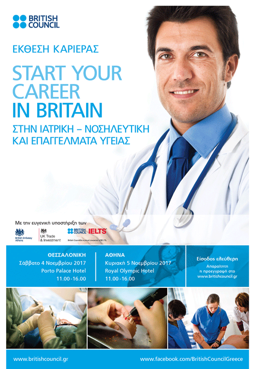 Έχουμε την τιμή να σας ενημερώσουμε ότι το British Council διοργανώνει Έκθεση Καριέρας για Ιατρούς, Νοσηλευτές και Επαγγελματίες στον Τομέα της Υγείας στη Θεσσαλονίκη το Σάββατο 4 Νοεμβρίου και στην Αθήνα την Κυριακή 5 Νοεμβρίου, με τη συμμετοχή κρατικών νοσοκομείων καθώς και καταξιωμένων φορέων που ενδιαφέρονται για άμεση πρόσληψη κατάλληλων υποψηφίων.