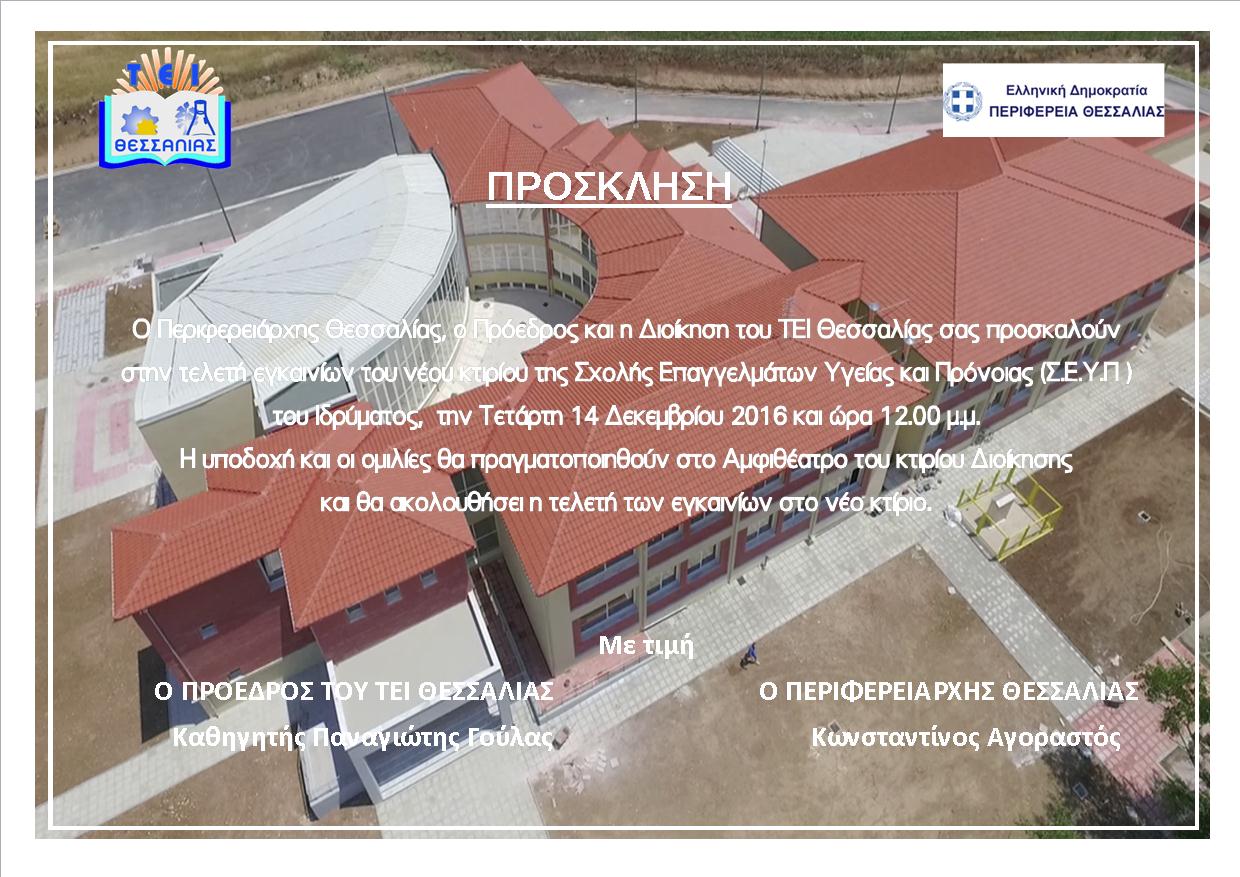 Τα εγκαίνια του νέου κτιρίου της Σχολής Επαγγελμάτων Υγείας και Πρόνοιας του Τ.Ε.Ι. Θεσσαλίας, θα πραγματοποιηθούν την Τετάρτη 14/12/2016 στις 12:00 παρουσία του Περιφερειάρχη κ. Αγοραστού Κωνσταντίνου.