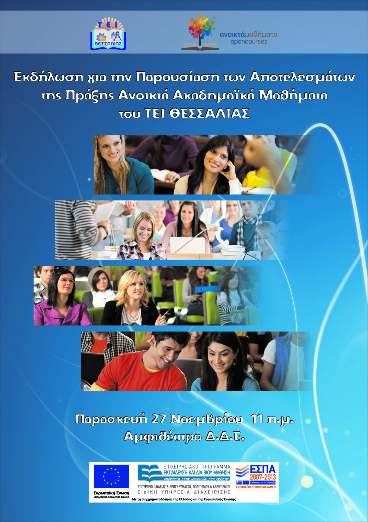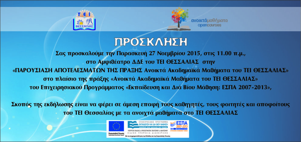 Η εκδήλωση θα πραγματοποιηθεί στο αμφιθέατρο των τμημάτων Διοίκησης Επιχειρήσεων & Μηχανικών Πληροφορικής του ΤΕΙ Θεσσαλίας στη Λάρισα.