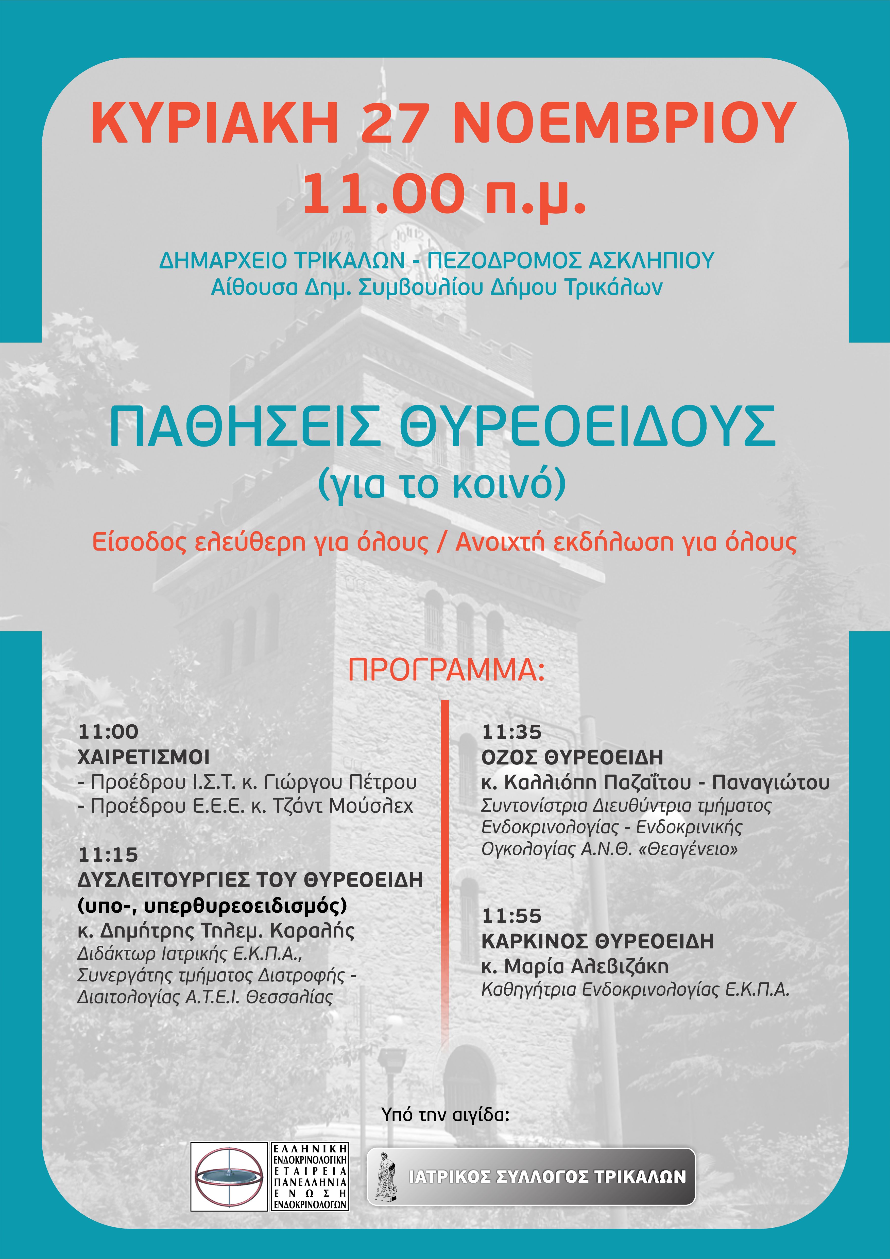 | Την Κυριακή 27 Νοεμβρίου, στα πλαίσια της 30ης Μετεκπαιδευτικής Συνάντησης Ενδοκρινολόγων, εκπρόσωποι του τμήματος θυρεοειδούς της Ελληνικής Ενδοκρινολογικής Εταιρείας θα αναπτύξουν το θέμα "Παθήσεις Θυρεοειδούς" στην αίθουσα συνεδριάσεων του Δημαρχείου Τρικάλων.
